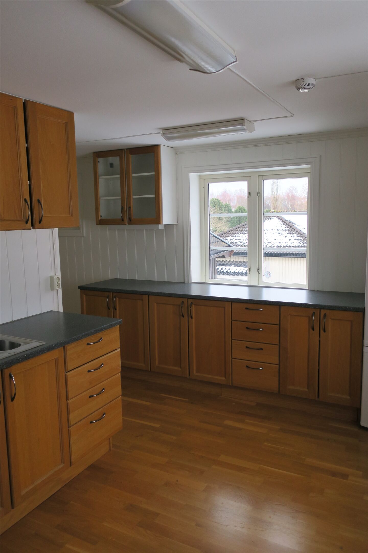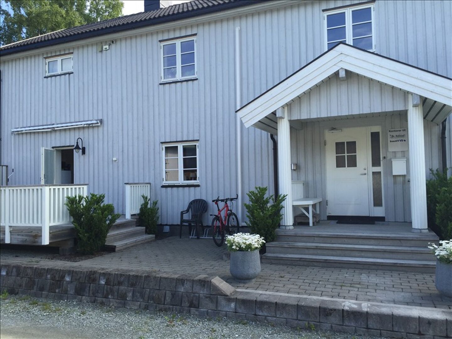 - I første etasje er det kontorlokaler og spiserom som leies ut til Brødrene Hofstad AS. Lokalene på kontordelen er på ca 65 m2, og består av tre kontor, ekspedisjonslokale, og bad/ toalett. Spiserommet er på ca 22m2